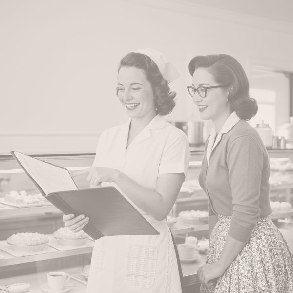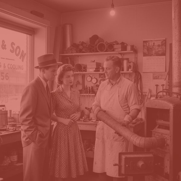 Retro image of a pharmacist showing a desktop computer display labeled "HELP PAYMENTS" to a man and woman in a vintage shop.
