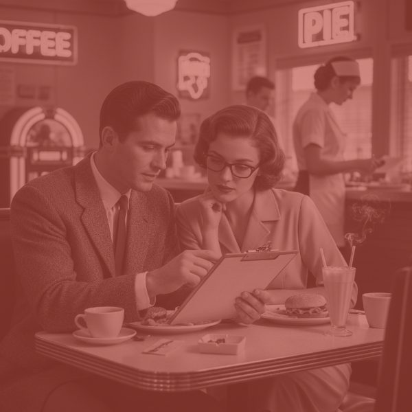 Black and white photo of two Black businessmen in suits sitting across from each other in a diner booth in the 1950s or 1960s. They are eating, talking, and have papers on the table between them. Neon signs for "COFFEE" and "PIE" are visible, along with a jukebox and a waitress behind the counter.