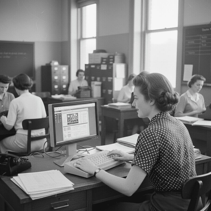 Black and white photo of a 1950s office with four smiling colleagues gathered around a desk. A businessman in a suit stands next to a woman in a white blouse, looking at a tall stack of papers. A man and a woman sitting at the desk are looking at the computer monitor displaying a spreadsheet labeled "Digital Ledger."