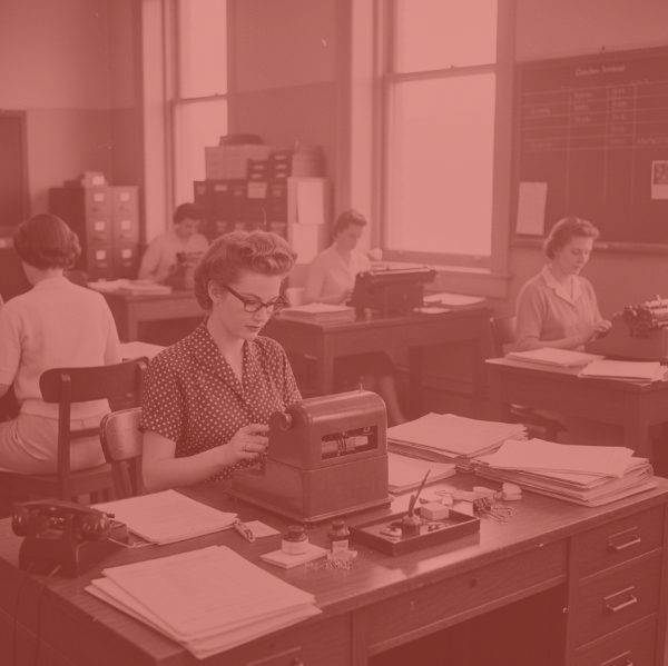 Red tinted photo of a 1950s office with four smiling colleagues gathered around a desk. A businessman in a suit stands next to a woman in a white blouse, looking at a tall stack of papers. A man and a woman sitting at the desk are looking at the computer monitor displaying a spreadsheet labeled "Digital Ledger."